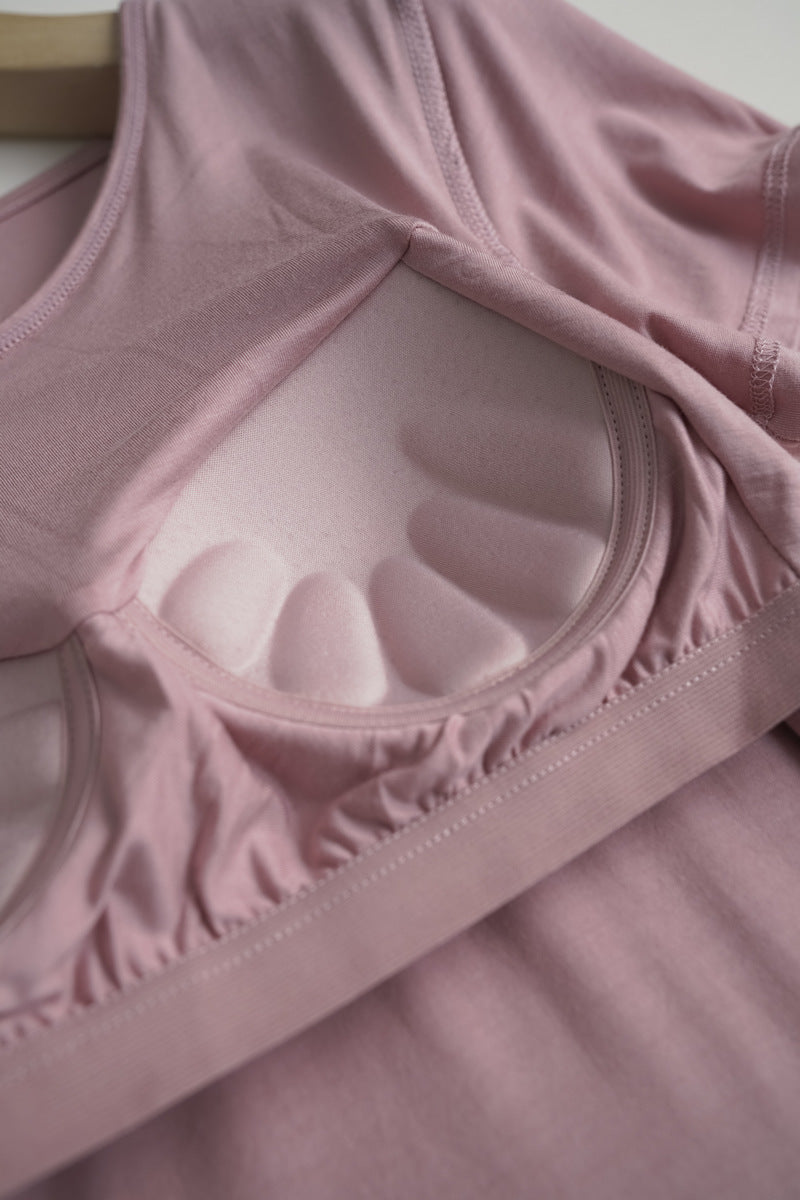 Inner layer offers soft support and holds bra cups securely. Outer layer is breathable, stretchable, and lightweight for all-day comfort. Integrated bra cups provide gentle lift and shaping without the need for an additional bra.